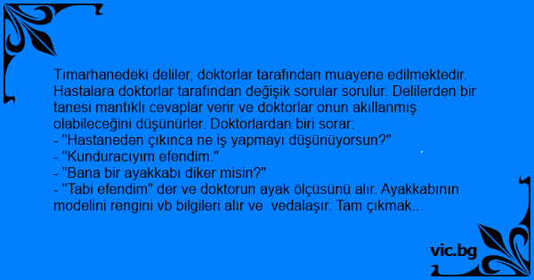 Tımarhanedeki deliler, doktorlar tarafından muayene edilmektedir. Hastalara doktorlar tarafından değişik sorular sorulur. Delilerden bir tanesi mantıklı cevaplar verir ve doktorlar onun akıllanmış olabileceğini düşünürler. Doktorlardan biri sorar: