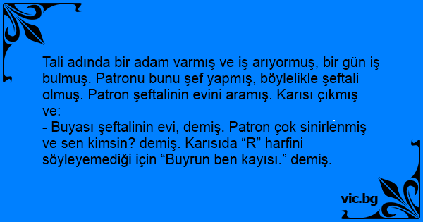 - Buyası şeftalinin evi, demiş. Patron çok sinirlenmiş ve sen kimsin? demiş. Karısıda “R” harfini söyleyemediği için “Buyrun ben kayısı.” demiş.