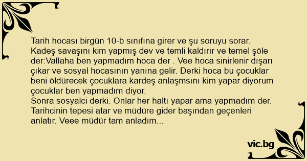 Tarih hocası birgün 10-b sınıfına girer ve şu soruyu sorar. Kadeş savaşını kim yapmış dev ve temli kaldırır ve temel şöle der:Vallaha ben yapmadım hoca der . Vee hoca sinirlenir dışarı çıkar ve sosyal hocasının yanına gelir. Derki hoca bu çocuklar beni öldürecek çocuklara kardeş anlaşmsını kim yapar diyorum çocuklar ben yapmadım diyor.