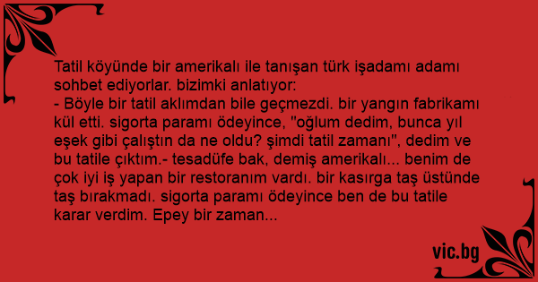 - Böyle bir tatil aklımdan bile geçmezdi. bir yangın fabrikamı kül etti. sigorta paramı ödeyince, "oğlum dedim, bunca yıl eşek gibi çalıştın da ne oldu? şimdi tatil zamanı", dedim ve bu tatile çıktım.- tesadüfe bak, demiş amerikalı... benim de çok iyi iş yapan bir restoranım vardı. bir kasırga taş üstünde taş bırakmadı. sigorta paramı ödeyince ben de bu tatile karar verdim. Epey bir zaman geçtikten sonra, sessizliği bizim iş adamı bozmuş: