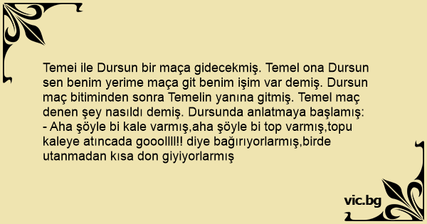 Temei ile Dursun bir maça gidecekmiş. Temel ona Dursun sen benim yerime maça giт benim işim var demiş. Dursun maç bitiminden sonra Temelin yanına gitmiş. Temel maç denen şey nasıldı demiş. Dursunda anlatmaya başlamış: