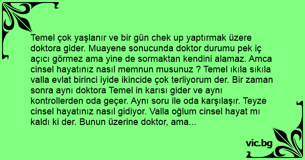 Temel çok yaşlanır ve bir gün chek up yaptırmak üzere doktora gider. Muayene sonucunda doktor durumu pek iç açıcı görmez ama yine de sormaktan kendini alamaz. Amca cinsel hayatınız nasıl memnun musunuz ? Temel ıkıla sıkıla valla evlat birinci iyide ikincide çok terliyorum der. Bir zaman sonra aynı doktora Temel in karısı gider ve aynı kontrollerden oda geçer. Aynı soru ile oda karşılaşır. Teyze cinsel hayatınız nasıl gidiyor. Valla oğlum cinsel hayat mı kaldı ki der. Bunun üzerine doktor, ama nasıl olur Temel amca birincide iyi ama ikincide terlediğinden bahsediyordu. Eeee doğru tabi birincisini kışın, ikincisini yazın yaparsa tabii ki öyle olur.
