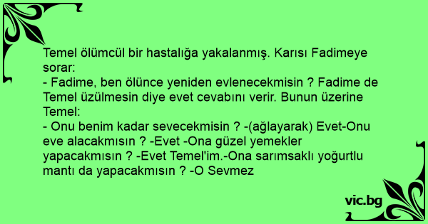 - Fadime, ben ölünce yeniden evlenecekmisin ? Fadime de Temel üzülmesin diye evet cevabını verir. Bunun üzerine Temel: