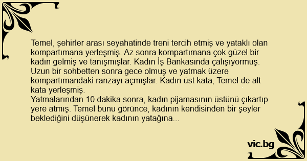 Temel, şehirler arası seyahatinde treni tercih etmiş ve yataklı olan kompartımana yerleşmiş. Az sonra kompartımana çok güzel bir kadın gelmiş ve tanışmışlar. Kadın İş Bankasında çalışıyormuş.