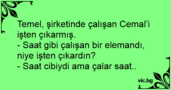 Temel, şirketinde çalışan Cemal’i işten çıkarmış.<br />- Saat gibi çalışan bir elemandı, niye işten çıkardın?<br />- Saat cibiydi ama çalar saat..