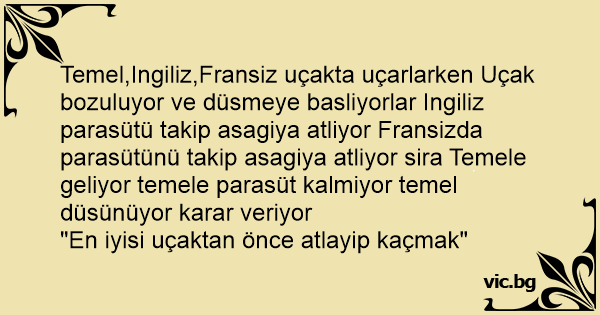 Temel,Ingiliz,Fransiz uçakta uçarlarken Uçak bozuluyor ve düsmeye basliyorlar Ingiliz parasütü takip asagiya atliyor Fransizda parasütünü takip asagiya atliyor sira Temele geliyor temele parasüt kalmiyor temel düsünüyor karar veriyor