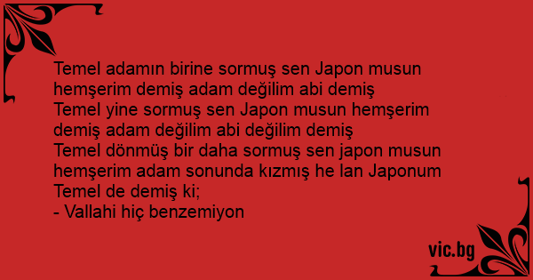 Temel dönmüş bir daha sormuş sen japon musun hemşerim adam sonunda kızmış he lan Japonum Temel de demiş ki;