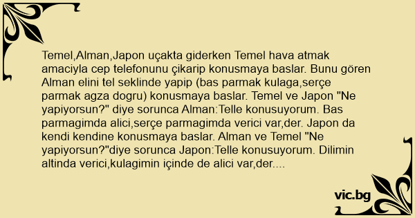 Temel,Alman,Japon uçakta giderken Temel hava atmak amaciyla cep telefonunu çikarip konusmaya baslar. Bunu gören Alman elini tel seklinde yapip (bas parmak kulaga,serçe parmak agza dogru) konusmaya baslar. Temel ve Japon "Ne yapiyorsun?" diye sorunca Alman:Telle konusuyorum. Bas parmagimda alici,serçe parmagimda verici var,der. Japon da kendi kendine konusmaya baslar. Alman ve Temel "Ne yapiyorsun?"diye sorunca Japon:Telle konusuyorum. Dilimin altinda verici,kulagimin içinde de alici var,der. Buna bozulan Temel bir çare bulmayi ister. Hava atmak ister ve bulur. Temel birden osurur ve Alman ile Japon "Ne yaptin?"diye sorar. Temel:Memlekete fax çektum da