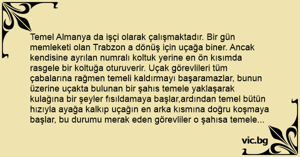 Temel Almanya da işçi olarak çalışmaktadır. Bir gün memleketi olan Trabzon a dönüş için uçağa biner. Ancak kendisine ayrılan numralı koltuk yerine en ön kısımda rasgele bir koltuğa oturuverir. Uçak görevlileri tüm çabalarına rağmen temeli kaldırmayı başaramazlar, bunun üzerine uçakta bulunan bir şahıs temele yaklaşarak kulağına bir şeyler fısıldamaya başlar,ardından temel bütün hızıyla ayağa kalkıp uçağın en arka kısmına doğru koşmaya başlar, bu durumu merak eden görevliler o şahısa temele neler söylediğini merak edip o kişiye temöelin bu ani hareketinin sebebi sorulmuş,o kişi; temele sadece uçağın arka kısmının Trabzona gittiğini söylediğini belirtmiştir.