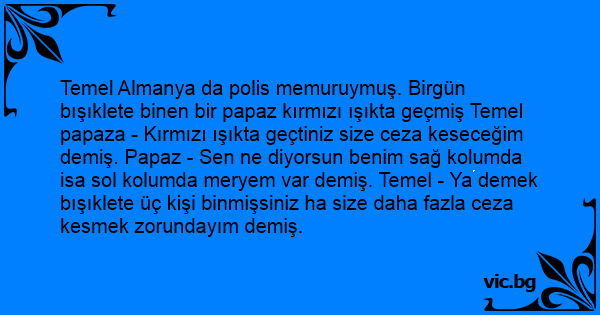 Temel Almanya da polis memuruymuş. Birgün bışıklete binen bir papaz kırmızı ışıkta geçmiş Temel papaza - Kırmızı ışıkta geçtiniz size ceza keseceğim demiş. Papaz - Sen ne diyorsun benim sağ kolumda isa sol kolumda meryem var demiş. Temel - Ya demek bışıklete üç kişi binmişsiniz ha size daha fazla ceza kesmek zorundayım demiş.