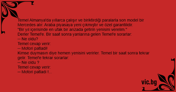 Temel Almanya'da yıllarca çalışır ve biriktirdiği paralarla son model bir Mercedes alır. Araba piyasaya yeni çıkmıştır ve özel garantilidir.