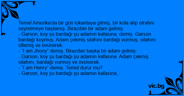 - Garson, koy şu bardağı şu adamın kafasına, demiş. Garson bardağı koymuş. Temel çekmiş silahını adamı alnından vurmuş, silahını üflemiş ve.