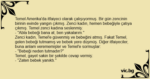 Temel Amerika'da itfaiyeci olarak çalışıyormuş. Bir gün zencinin birinin evinde yangın çıkmış. Zenci kadın, hemen bebeğiyle çatıya çıkmış. Temel zenci kadına seslenmiş: