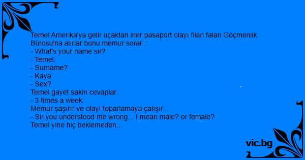 Do you speak english? Interviewer: Αχμέτ Χουσεϊν - Do you speak English? Reporter: "Excuse me, may I interview you?" — Qual o seu nome? "Name?" Neulich bei der Einwanderungsbehörde:,"Name?","Abu Dalah Sarafi.","Sex?","Four times a week.","No, no, no... male or female?","Male, female... sometimes camel..." No balcão da Alfandega: Seu nome ? Abu Abdalah Sarafi. Sexo? Quatro vezes por semana. Não, não, não! Homem ou mulher? Homem, mulher. Algumas vezes camelo. - Name? - Abdul Anubi al-Dzabiri. - Sex? - Four times a week - No, no, male or female? - Male, female, sometimes camel... En man som är dålig på engelska kommer in på en arbetsförmedling i Holland för att söka jobb! - Name - Abu Dalah Sarafi. - Sex? - Four times a week. - No, no, no, male or female? - Male,... Q: Your name please? A: Abdul Aziz Q: Sex? A: Yes. Two times every week. Q: No no. I mean, Male or Female? A: Not matter. Sometimes also camel ! An arab at the airport: - Name? - Abdul al-Rhazib. - Sex? - Three to five times a week. - No, no... I mean male or female? - Male, female, sometimes camel. - Holy cow! - Cow, sheep, animals in... An arab at the airport: - Name? - Abdul al Rahzib. - Sex? - Three to five times a week. - No, no...I mean Male or female? - Male, female, sometimes camel. - Holy cow! - Yes, cow, sheep,... Q: Naam? A: Abdul Asis Q: Sexe? A: Ja iedere week 2 keer. Q: Nee, ik bedoel man of vrouw? A: Maakt niet uit, soms ook kameel. En la oficina árabe le atienden por teléfono: - ¿Me dice su nombre, por favor? - Jawad Gadaff - ¿Sexo? - 1 vez al día, pero no siempre. - ¡No, hombre, no! Me refiero, ¿hombre o mujer? - Correcto,... All’Ufficio Immigrazioni: – Nome? – Mhoamhed. – Sesso? – 5 volte alla settimana. – Ma non in quel senso: maschio o femmina? – No importa, a volte anche con cammelli. Chiedono a Gheddafi: "ciao, nome?" e lui: "Gheddafi", e poi: "sesso?" e lui risponde: "cinque volte al giorno!" e loro chiedono: "con maschio o femmina?" e lui: "va bene anche cammello!". - NAME? - Muhjmatil Ahmed. - SEX? - Three times a week! - NO, I MEAN; MALE OR FEMALE? - Doesnt matter. Sometimes even with camel... - Name? - Abdul al-Rhazib. - Sex? - Three to five times a week. - No, no! I mean male or female? - Male, female, sometimes camel... - Holy cow! - Yes. Cow, sheep... animals in general. - But isn't... An Arab at the airport: - 'Name?' - 'Abdul al-Rhazib.' - 'Sex?' - 'Three to five times a week.' - 'No, no... I mean male or female?' - 'Male, female, sometimes camel.' - 'Holy cow!' - 'Yes, cow,...