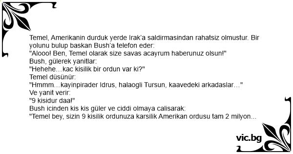 "Temel bey, sizin 9 kisilik ordunuza karsilik Amerikan ordusu tam 2 milyon askerden olusmaktadir!" der.