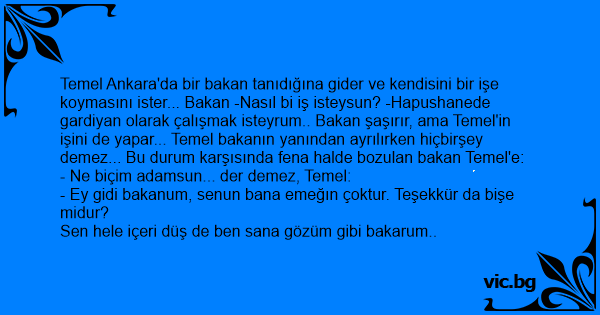 Temel Ankara'da bir bakan tanıdığına gider ve kendisini bir işe koymasını ister... Bakan -Nasıl bi iş isteysun? -Hapushanede gardiyan olarak çalışmak isteyrum.. Bakan şaşırır, ama Temel'in işini de yapar... Temel bakanın yanından ayrılırken hiçbirşey demez... Bu durum karşısında fena halde bozulan bakan Temel'e: