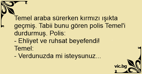 Temel araba sürerken kırmızı ışıkta geçmiş. Tabii bunu gören polis Temel'i durdurmuş. Polis: