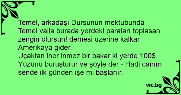Temel, arkadaşı Dursunun mektubunda Temel valla burada yerdeki paraları toplasan zengin olursun! demesi üzerine kalkar Amerikaya gider.