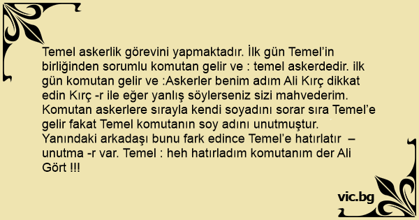 Temel askerlik görevini yapmaktadır. İlk gün Temel’in birliğinden sorumlu komutan gelir ve : temel askerdedir. ilk gün komutan gelir ve :Askerler benim adım Ali Kırç dikkat edin Kırç -r ile eğer yanlış söylerseniz sizi mahvederim. Komutan askerlere sırayla kendi soyadını sorar sıra Temel’e gelir fakat Temel komutanın soy adını unutmuştur. Yanındaki arkadaşı bunu fark edince Temel’e hatırlatır – unutma -r var. Temel : heh hatırladım komutanım der Ali Gört !!!