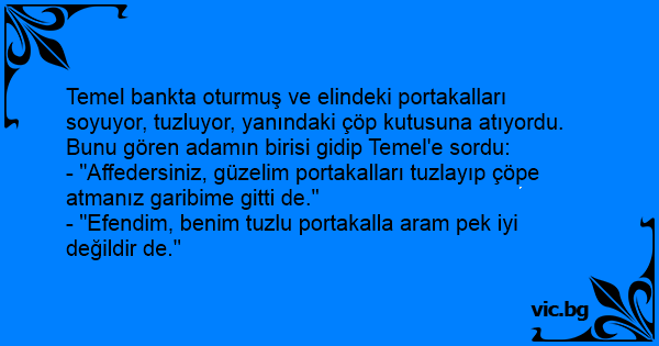 Temel bankta oturmuş ve elindeki portakalları soyuyor, tuzluyor, yanındaki çöp kutusuna atıyordu. Bunu gören adamın birisi gidip Temel'e sordu: