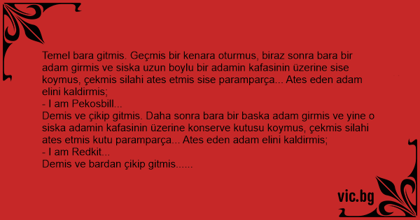 Temel bara gitmis. Geçmis bir kenara oturmus, biraz sonra bara bir adam girmis ve siska uzun boylu bir adamin kafasinin üzerine sise koymus, çekmis silahi ates etmis sise paramparça... Ates eden adam elini kaldirmis;