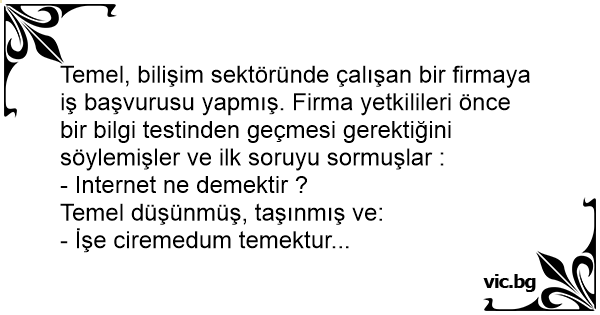 Temel, bilişim sektöründe çalışan bir firmaya iş başvurusu yapmış. Firma yetkilileri önce bir bilgi testinden geçmesi gerektiğini söylemişler ve ilk soruyu sormuşlar :