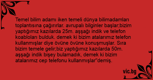 Temel bilim adamı iken temeli dünya bilimadamları toplantısına çağırırlar. avrupalı bilginler başlar;bizim yaptığımız kazılarda 25m. aşşağı indik ve telefon koabloları bulduk. demek ki bizim atalarımız telefon kullanmışlar diye övüne övüne konuşmuşlar. Sıra bizim temele gelir;biz yaptığımız kazılarda 50m. aşşağı indik bişey bulamadık, demek ki bizim atalarımız cep telefonu kullanmışlar"demiş.