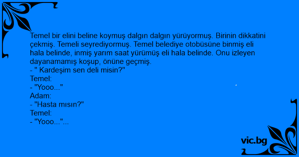 Temel bir elini beline koymuş dalgın dalgın yürüyormuş. Birinin dikkatini çekmiş. Temeli seyrediyormuş. Temel belediye otobüsüne binmiş eli hala belinde, inmiş yarım saat yürümüş eli hala belinde. Onu izleyen dayanamamış koşup, önüne geçmiş.