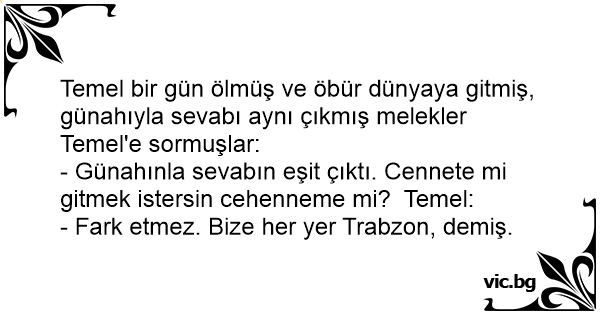 Temel bir gün ölmüş ve öbür dünyaya gitmiş, günahıyla sevabı aynı çıkmış melekler Temel'e sormuşlar: