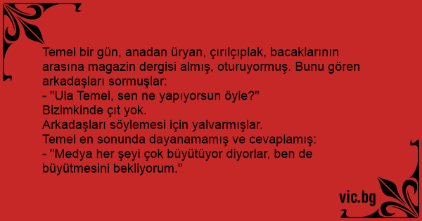 Temel bir gün, anadan üryan, çırılçıplak, bacaklarının arasına magazin dergisi almış, oturuyormuş. Bunu gören arkadaşları sormuşlar: