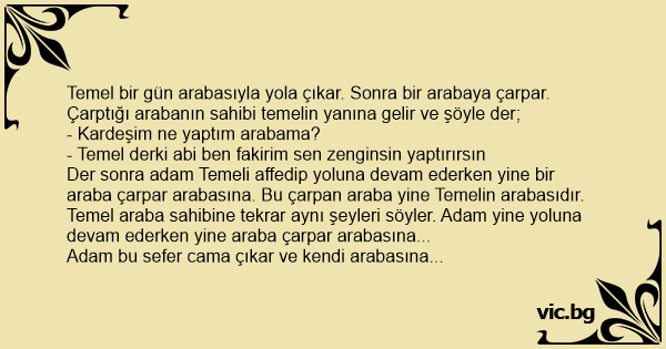 Temel bir gün arabasıyla yola çıkar. Sonra bir arabaya çarpar. Çarptığı arabanın sahibi temelin yanına gelir ve şöyle der;