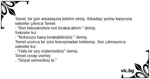 Temel, bir gün arkadaşına telefon etmiş. Arkadaşı yerine karşısına sekreter çıkınca Temel: