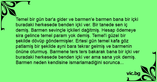 Temel bir gün bar'a gider ve barmen'e barmen bana bir içki buradaki herkesede benden içki ver. Bir tanede sen iç demiş. Barmen sevinçle içkileri dağitmiş. Hesap ödemeye sira gelince temel param yok demiş. Temel'i güzel bir şekilde dövüp göndermişler. Ertesi gün temel kafa göz patlamiş bir şekilde ayni bara tekrar gelmiş ve barmenin önüne oturmuş. Barmene ters ters bakarak bana bir içki ver buradaki herkesede benden içki ver ama sana yok demiş. Barmen neden kendisine ismarlamadiğini sorunca sen içince sapitiyorsun ondan demiş....