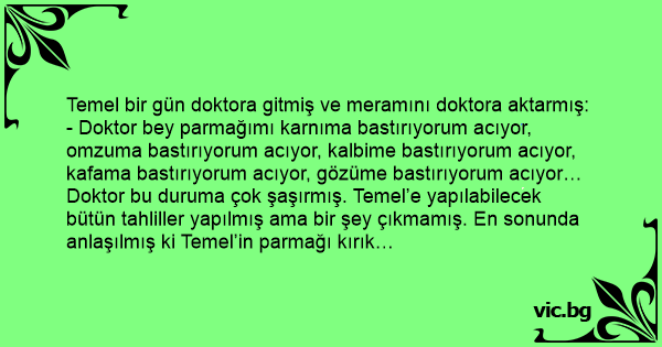 Temel doktora gitmis. - Hastayim doktor, cok hastayim, vucudumun her yeri agriyor, nereme dokunsam sizim sizim sizliyor, dokuluyor… Doktor: - Nasil hastalik o, tum vucudunu saran, agritan? Temel...