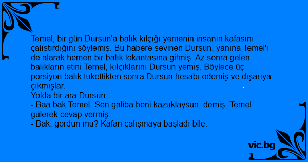 Temel, bir gün Dursun'a balık kılçığı yemenin insanın kafasını çalıştırdığını söylemiş. Bu habere sevinen Dursun, yanına Temel'i de alarak hemen bir balık lokantasına gitmiş. Az sonra gelen balıkların etini Temel, kılçıklarını Dursun yemiş. Böylece üç porsiyon balık tükettikten sonra Dursun hesabı ödemiş ve dışarıya çıkmışlar.