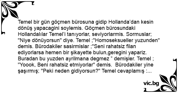 Temel bir gün göçmen bürosuna gidip Hollanda’dan kesin dönüş yapacagini soylemis. Göçmen bürosundaki Hollandalılar Temel’i tanıyorlar, seviyorlarmis. Sormuslar; "Niye dönüyorsun" diye. Temel ;"Homoseksueller yuzunden" demis. Bürodakiler sasirmislar ;"Seni rahatsiz filan ediyorlarsa hemen bir şikayette bulun,geregini yapariz. Buradan bu yuzden ayrilmana degmez ” demişler. Temel ; "Yoook, Beni rahatsiz etmiyorlar" demis. Bürodakiler yine şaşırmış; "Peki neden gidiyorsun?" Temel cevaplamış :