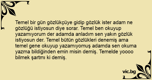Temel bir gün gözlükçüye gidip gözlük ister adam ne gözlüğü istiyosun diye sorar. Temel ben okuyup yazamıyorum der adamda anladım sen yakın gözlük istiyosun der. Temel bütün gözlükleri denemiş ama temel gene okuyup yazamıyomuş adamda sen okuma yazma bildiğinden emin misin demiş. Temelde yoooo bilmek şartmı ki demiş.