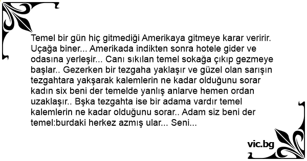 Temel bir gün hiç gitmediği Amerikaya gitmeye karar veririr. Uçağa biner... Amerikada indikten sonra hotele gider ve odasına yerleşir... Canı sıkılan temel sokağa çıkıp gezmeye başlar.. Gezerken bir tezgaha yaklaşır ve güzel olan sarışın tezgahtara yakşarak kalemlerin ne kadar olduğunu sorar kadın six beni der temelde yanlış anlarve hemen ordan uzaklaşır.. Bşka tezgahta ise bir adama vardır temel kalemlerin ne kadar olduğunu sorar.. Adam siz beni der temel:burdaki herkez azmış ular... Seni dikeceğime yukardaki karıyı dikerim daha iyidir... Ve sarışın kadının yanına gider ve arkasında dikini çıkarır... Bunu gören kadın hemen:no fak. No fak!der. Temelde:ufak mufak idare edeceksin bacım"der