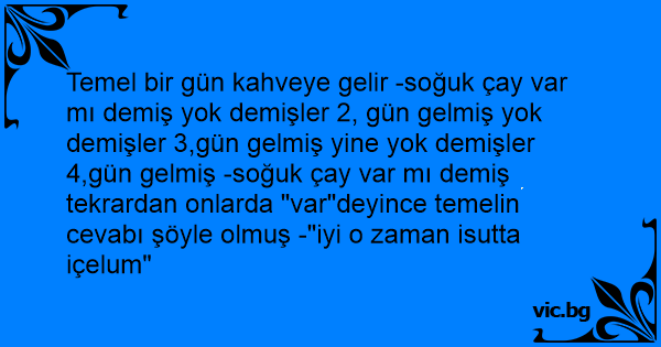 Temel bir gün kahveye gelir -soğuk çay var mı demiş yok demişler 2, gün gelmiş yok demişler 3,gün gelmiş yine yok demişler 4,gün gelmiş -soğuk çay var mı demiş tekrardan onlarda "var"deyince temelin cevabı şöyle olmuş -"iyi o zaman isutta içelum"