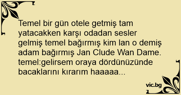 Temel bir gün otele getmiş tam yatacakken karşı odadan sesler gelmiş temel bağırmış kim lan o demiş adam bağırmış Jan Clude Wan Dame. temel:gelirsem oraya dördünüzünde bacaklarını kırarım haaaaa...