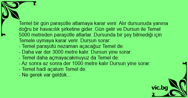 Temel bir gün paraşütle atlamaya karar verir. Alır dursunuda yanına doğru bir havacılık şirketine gider. Gün gelir ve Dursun ile Temel 5000 metreden paraşütle atlarlar. Dursunda bir şey bilmediği için Temele uymaya karar verir. Dursun sorar: