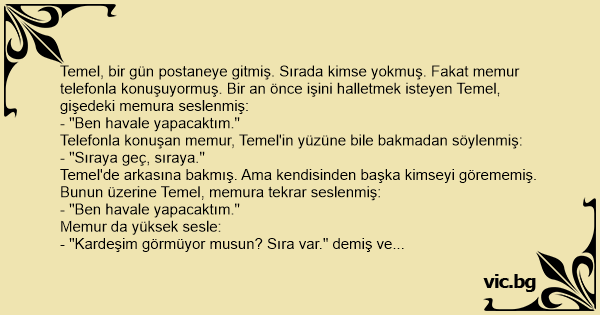 Temel, bir gün postaneye gitmiş. Sırada kimse yokmuş. Fakat memur telefonla konuşuyormuş. Bir an önce işini halletmek isteyen Temel, gişedeki memura seslenmiş: