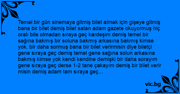 Temel bir gün sinemaya gitmiş bilet almak için gişeye gitmiş bana bir bilet demiş bilet sатаn adam gazete okuyormuş hiç oralı bile olmadan sıraya geç kardeşim demiş temel bir sağına bakmış bir soluna bakmış arkasına bakmış kimse yok. bir daha sormuş bana bir bilet verirmisin diye biletçi gene sıraya geç demiş temel gene sağına solun arkasına bakmış kimse yok kendi kendine demişki bir daha sorayım gene sıraya geç derse 1-2 tane çakayım demiş bir bilet verir misin demiş adam tam sıraya geç kelimesini bitirmeden buna 1-2 tane çakmış biletçi kendine gelmiş demiş ki kim vurdu bana temelde ne bileyim bu kalabalıkta kimin vurduğunu demiş.