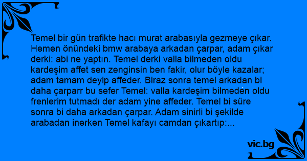 Temel bir gün trafikte hacı murat arabasıyla gezmeye çıkar. Hemen önündeki bmw arabaya arkadan çarpar, adam çıkar derki: abi ne yaptın. Temel derki valla bilmeden oldu kardeşim affet sen zenginsin ben fakir, olur böyle kazalar; adam tamam deyip affeder. Biraz sonra temel arkadan bi daha çarparr bu sefer Temel: valla kardeşim bilmeden oldu frenlerim tutmadı der adam yine affeder. Temel bi süre sonra bi daha arkadan çarpar. Adam sinirli bi şekilde arabadan inerken Temel kafayı camdan çıkartıp: