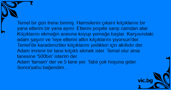 Temel bir gün trene binmiş. Hamsilerini çıkarır kılçıklarını bir yana etlerini bir yana ayırır. Etlerini poşete sarıp camdan atar. Kılçıklarını ekmeğin arasına koyup yemeğe başlar. Karşısındaki adam şaşırır ve 'niye etlerini attın kılçıklarını yiyorsun'der.