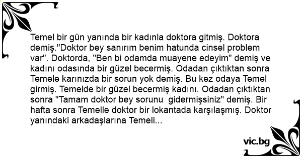 Temel bir gün yanında bir kadınla doktora gitmiş. Doktora demiş."Doktor bey sanırım benim hatunda cinsel problem var". Doktorda, "Ben bi odamda muayene edeyim" demiş ve kadını odasında bir güzel becermiş. Odadan çıktıktan sonra Temele karınızda bir sorun yok demiş. Bu kez odaya Temel girmiş. Temelde bir güzel becermiş kadını. Odadan çıktıktan sonra "Tamam doktor bey sorunu gidermişsiniz" demiş. Bir hafta sonra Temelle doktor bir lokantada karşılaşmış. Doktor yanındaki arkadaşlarına Temeli göstererek demiş. "şu adamın karısını geçenlerde muayenehanemde hemde adam varken **ktimde adamın ruhu bile duymadı "Temelde yanındaki arkadaşlarına doktoru gösrererek, "geçenlerde bi orospu düşürdüm **kecek bi yer bulamadım bu adamın muayenehanesinde **iktim. Adamın ruhu bile duymadı"