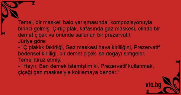 Temel, bir maskeli balo yarışmasında, kompozisyonuyla birinci gelmiş. Çırılçıplak, kafasında gaz maskesi, elinde bir demet çiçek ve önünde sallanan bir prezervatif.
