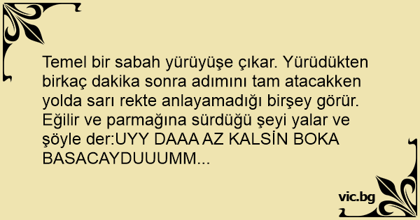 Temel bir sabah yürüyüşe çıkar. Yürüdükten birkaç dakika sonra adımını tam atacakken yolda sarı rekte anlayamadığı birşey görür. Eğilir ve parmağına sürdüğü şeyi yalar ve şöyle der:UYY DAAA AZ KALSİN BOKA BASACAYDUUUMM...