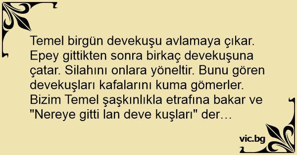 Temel birgün devekuşu avlamaya çıkar. Epey gittikten sonra birkaç devekuşuna çatar. Silahını onlara yöneltir. Bunu gören devekuşları kafalarını kuma gömerler. Bizim Temel şaşkınlıkla etrafına bakar ve "Nereye gitti lan deve kuşları" der…