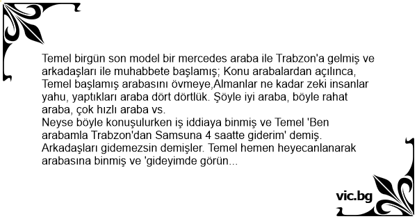 Neyse böyle konuşulurken iş iddiaya binmiş ve Temel 'Ben arabamla Trabzon'dan Samsuna 4 saatte giderim' demiş. Arkadaşları gidemezsin demişler. Temel hemen heyecanlanarak arabasına binmiş ve 'gideyimde görün uşaklar'demiş. Arkadaşları iyide biz senin oraya ne zaman vardığını nereden bileceğiz demişler.'